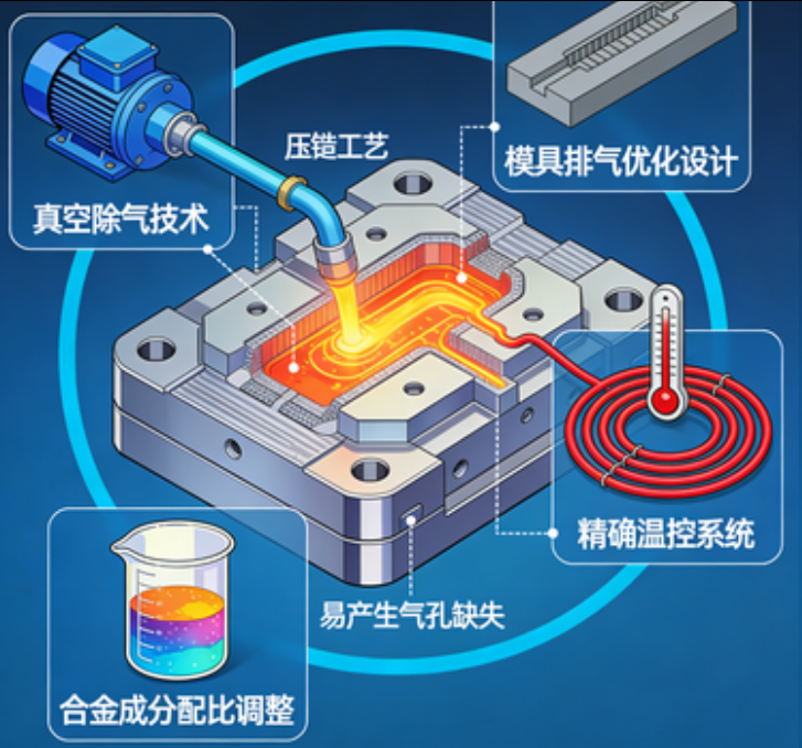 气孔缺陷是压铸过程中常见且严重影响压铸件质量的问题,它会降低铸件的力学性能、密封性和耐腐蚀性,甚至导致产品报废。控制压铸气孔缺陷,需要从合金熔炼、模具设计、压铸工艺等多个环节入手,采取针对性的技术措施。 在合金熔炼环节,严格控制合金液中的含气量是关键。合金液在熔炼过程中易吸收空气中的气体,尤其是氢气,因此需采用有效的除气方法。例如,在铝合金熔炼中,常用的除气方法有惰性气体吹洗法,通过向合